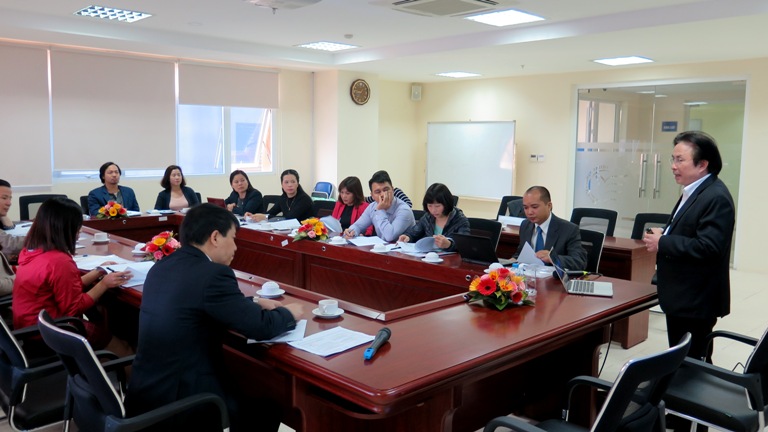 TS. Trần Quang Tiến, Giám đốc Học viện chủ trì hội thảo. PGS.TS Lê Phước Minh, Phó Giám đốc Học viện Quản lý Giáo dục chia sẻ, trao đổi về nội dung hội thảo. Đại biểu tham dự là lãnh đạo các đơn vị trực thuộc Học viện và viên chức Trung tâm Công nghệ thông tin và Thư viện.