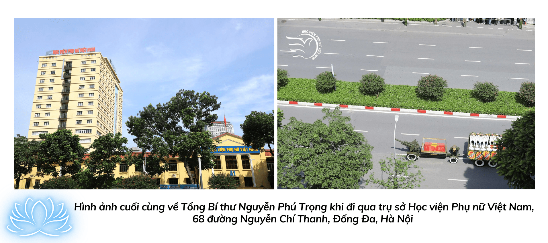 Hòa trong dòng người kính tiễn dọc những con đường đưa linh cữu Tổng Bí thư Nguyễn Phú Trọng từ nhà tang lễ quốc gia đến nghĩa trang Mai Dịch, lãnh đạo, viên chức, người lao động Học viện Phụ nữ Việt Nam có mặt tại 68 đường Nguyễn Chí Thanh xúc động nghẹn ngào phân ưu cùng gia quyết và trân trọng vĩnh biệt, chia xa mãi mãi người lãnh đạo Đảng kiên trung, một đời cống hiến cho Tổ quốc, cho Dân tộc, để lại nhiều dấu ấn sâu sắc trên cương vị Tổng Bí thư Ban Chấp hành Trung ương Đảng Cộng sản Việt Nam với lòng thành kính tri ân và ngưỡng mộ.